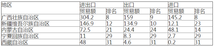 表6 2016年中国少数民族地区与"一带一路"沿线国家贸易情况(亿美元)