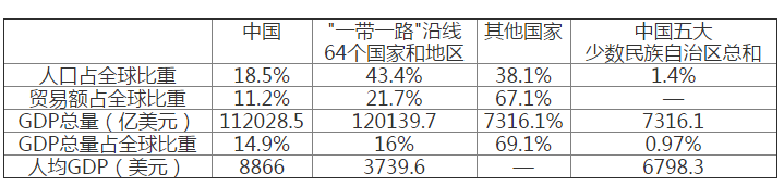 虽然相比其他国内地区,中国的民族地区经济发展程度相对较低。但是如果把这五大民族地区作为独立经济体来看,内蒙和广西的GDP规模约为1.8万亿元人民币,相当于在64个"一带一路"沿线国家和地区中GDP排名第15的经济体——巴基斯坦。即使是GDP规模最小的西藏,1150亿元的GDP规模也相当与排名第51位的波黑。数据表明,中国五大民族地区虽然在中国本土是相对比较小的经济体,但是在"一带一路"沿线上却实力不俗。2016年,中国五大民族地区与"一带一路"沿线国家和地区贸易总额约为540亿美元,其中进口额209亿美元,出口额331亿美元。中国五大民族地区对"一带一路"64个沿线国家和地区贸易顺差规模122亿美元,占全国对64国顺差总额的5%。