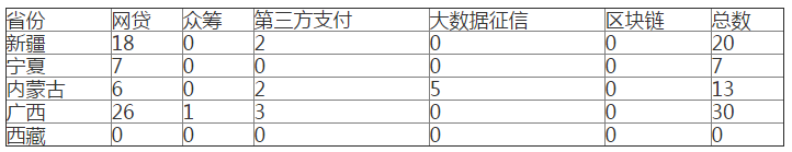 表8 各民族治区金融科技企业数量(按网贷、众筹、第三方支付、大数据征信和区块链划分)