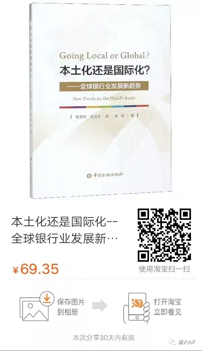 2019年1月,《本土化还是国际化?——全球银行业发展新趋势》(Going Local or Global?New Trends for the World’s Banks)正式由中国金融出版社出版发行,本书由浙江大学互联网金融研究院(浙大AIF)院长、国际联合商学院院长贲圣林教授,浙大AIF研究员、浙大经济学院金融系副主任俞洁芳,浙大AIF助理研究员、金融国际化工作室负责人顾月等共同编著。此前,该书目获得中国金融出版社3月新书推荐。