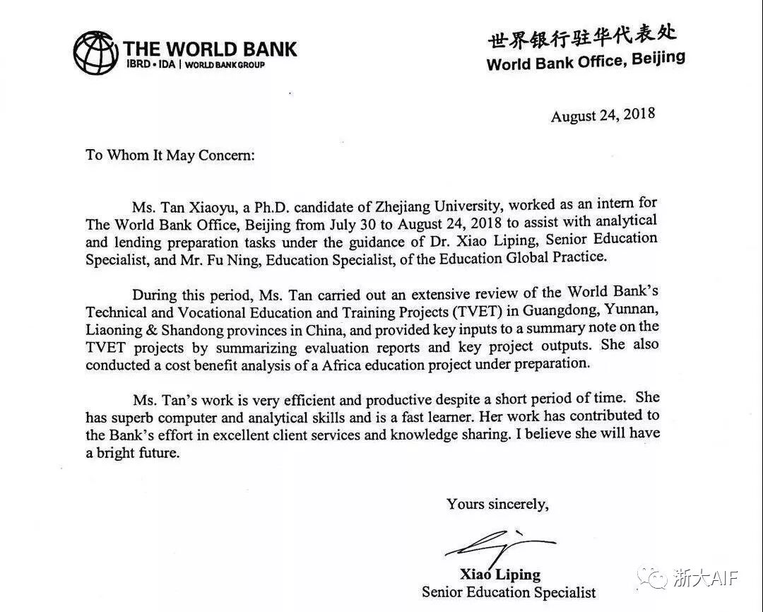 她曾赴世界银行实习,而让她印象十分深刻的是,当她被安排利用专业知识帮助某非洲国家教育投资项目建立投资回报模型的时候,在查资料的过程中,发现世界上还有许多欠发达国家的国民平均退休年龄几乎等于他们的自然寿命,这让她深深体会到教育与知识的投资真的可以改变无数人的生活,同时也从心底认为自己做的这些工作真的有着不平凡的意义,希望今后的自己也可以获得更多参与这类有意义活动的机会。