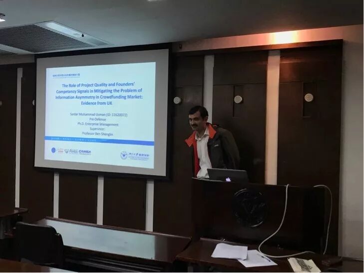 博士生Usman以The Role of Project Quality and Founders’ Competency Signals in Mitigating the Problem of Information Asymmetry in Crowdfunding Market: Evidence from UK为题,以英国的众筹市场为研究对象,从信号理论的角度切入分析了项目质量和发起人能力与项目成功率之间的关系。当前研究有助于推动众筹市场的持续发展,并完善了其对于广泛社会来说的的普遍经济意义。
