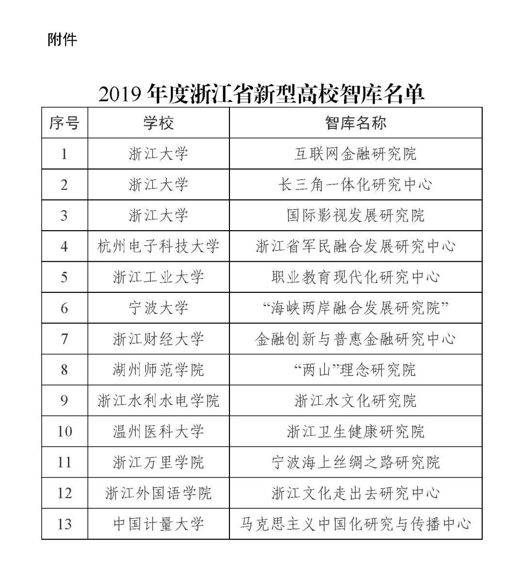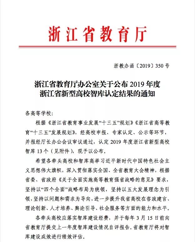 近日,浙江省教育厅发布通知,根据《浙江省教育事业发展“十三五”规划》《浙江省高等教育“十三五”发展规划》,通过高校申报、专家认定、公示等环节,经厅长办公室办公会议审议通过,认定了13个2019年浙江省新型高校智库。