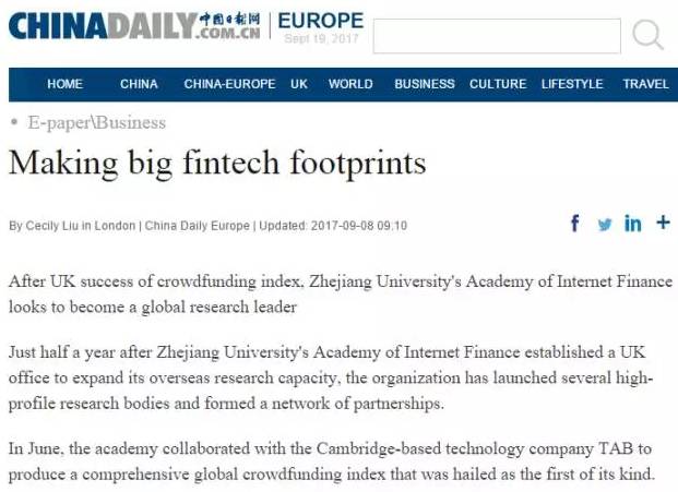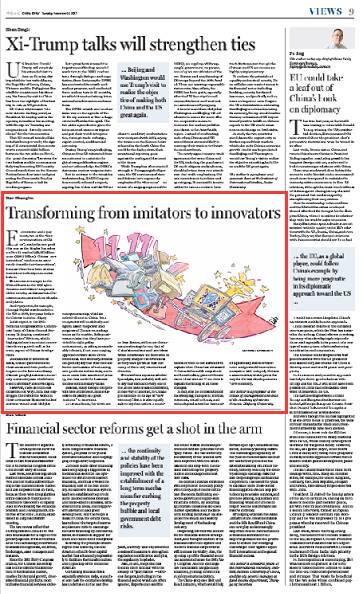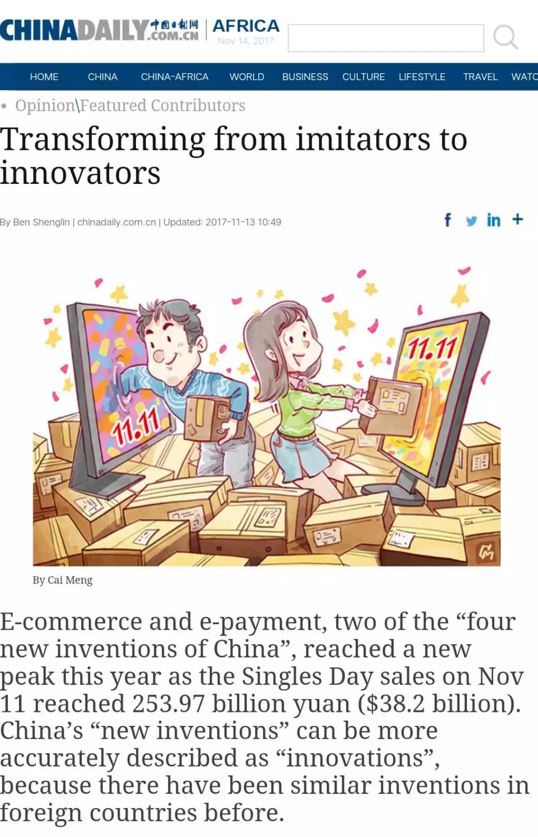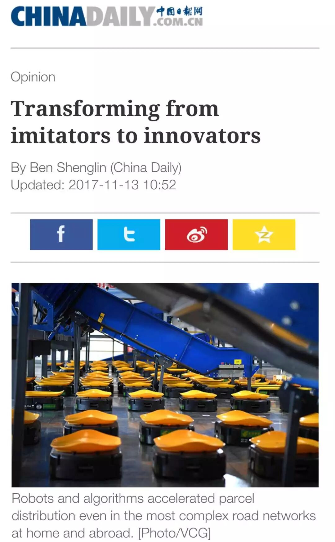 11月14日《China Daily》(中国日报,是中国国家英文日报,是唯一有效进入国际主流社会、国外媒体转载率最高的中国报纸)评论版、客户端、网站,都刊发了浙江大学互联网金融研究院院长贲圣林教授的署名文章《Transforming from imitators to innovators》,文中贲圣林教授评价了中国新经济领域的突出成就,指出中国已经实现了从模仿者到创新者的转变,并分析了这一成就取得背后深层次的原因。