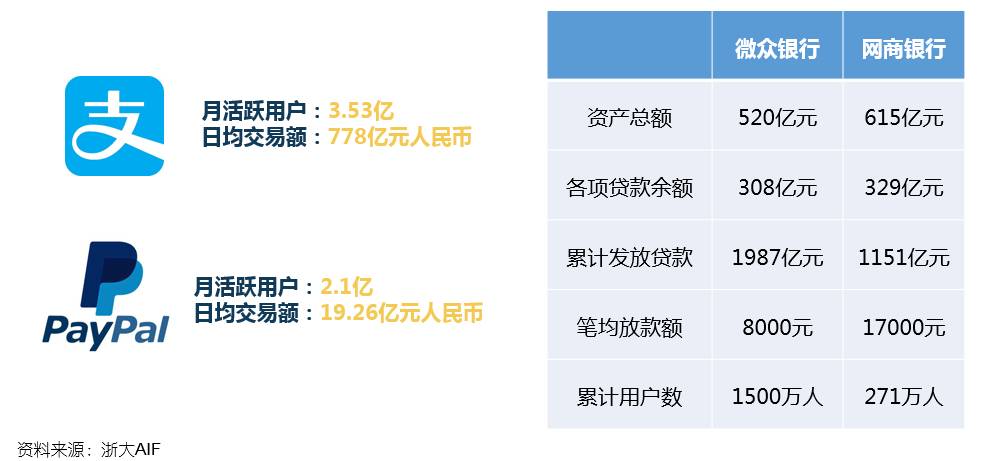 那么跟世界对比,中国的金融科技发展究竟处于什么位置呢?世界是不是在看中国?我觉得我们非常幸运,要感谢业界的努力,让咱们前几名的金融科技企业已达到全世界前列的位置,包括陆金所、蚂蚁金服等。来看一些更具体的数据:支付宝现在活跃用户数高达3.53亿人,是PayPal的1.7倍左右,而日均交易额为778亿人民币,是PayPal的40倍左右;再看看两家互联网银行,微众银行和网商银行,其实它们的资产规模都比较小,可能一个城商行都要比它们大一些,但是这两家互联网银行服务的用户数相当多,比如像微众银行用户超过1500万,网商银行服务小微企业和经营者的数量达到271万户。
