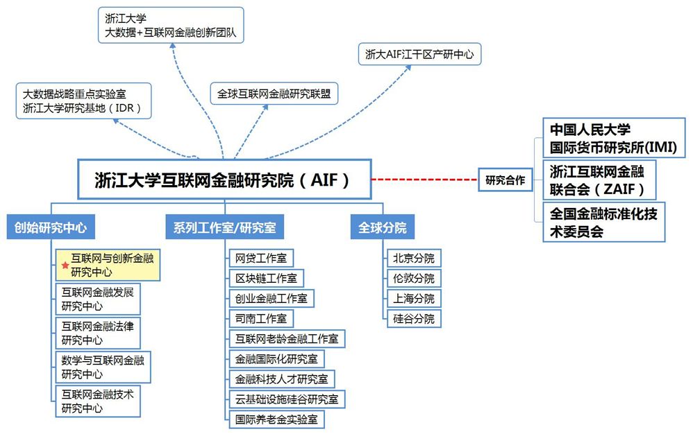 浙大AIF根据最新研究方向和需求,先后设立了包含区块链研究室、网贷研究室、司南研究室、金融国际化研究室、创业金融研究室、互联网老龄金融研究室、云基础设施硅谷研究室、金融科技人才研究室、国际养老金研究室九个研究室,从不同的角度聚焦互联网金融,开展跨学科研究。