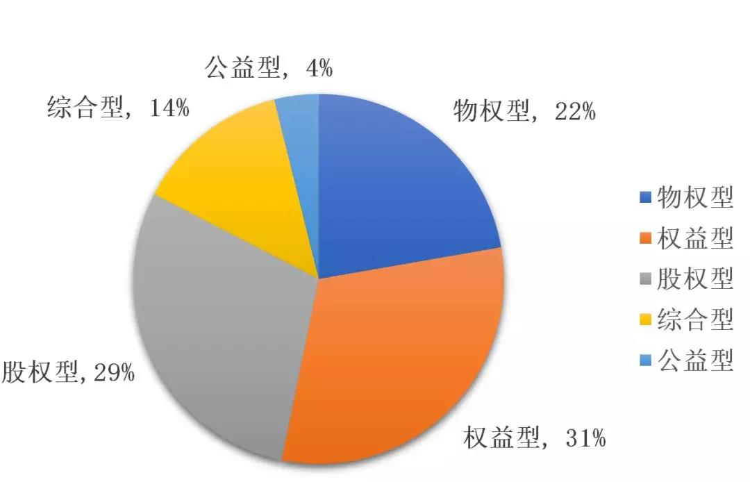 2.股权众筹。股权众筹融资模式是继P2P借贷之后发展起来的一种新型互联网融资模式,股权众筹是一种风险较高、期限较长的投资行为,其相对较低的进入门槛能降低小微企业的成本,是我国当前多层资本市场的自然延伸。然而,我国股权众筹面临最大的阻碍来自于法律监管方面缺失空白,对众筹行业的政策界定不够明晰。2016年出台的《互联网金融风险专项整治工作实施方案》和《股权众筹风险专项工作实施方案》虽然加强了对股权融资的风险监控,但是监管政策界定仍然模糊,无法契合目前股权众筹行业的运作需求。2015年的股权众筹井喷式发展,但是由于监管不到位,存在法律风险、模式创新风险、道德风险等一系列行业风险,股权众筹平台挪用资金、捐款潜逃的事件层出不穷。后受相关政策监管调整、资本寒冬等影响,自2016年以来股权众筹已经步入缓慢调整发展阶段,2017年12月底,全国众筹平台共计280家,与2016年同期相比下降约33%。全国众筹平台运营类型分布情况如图1所示。