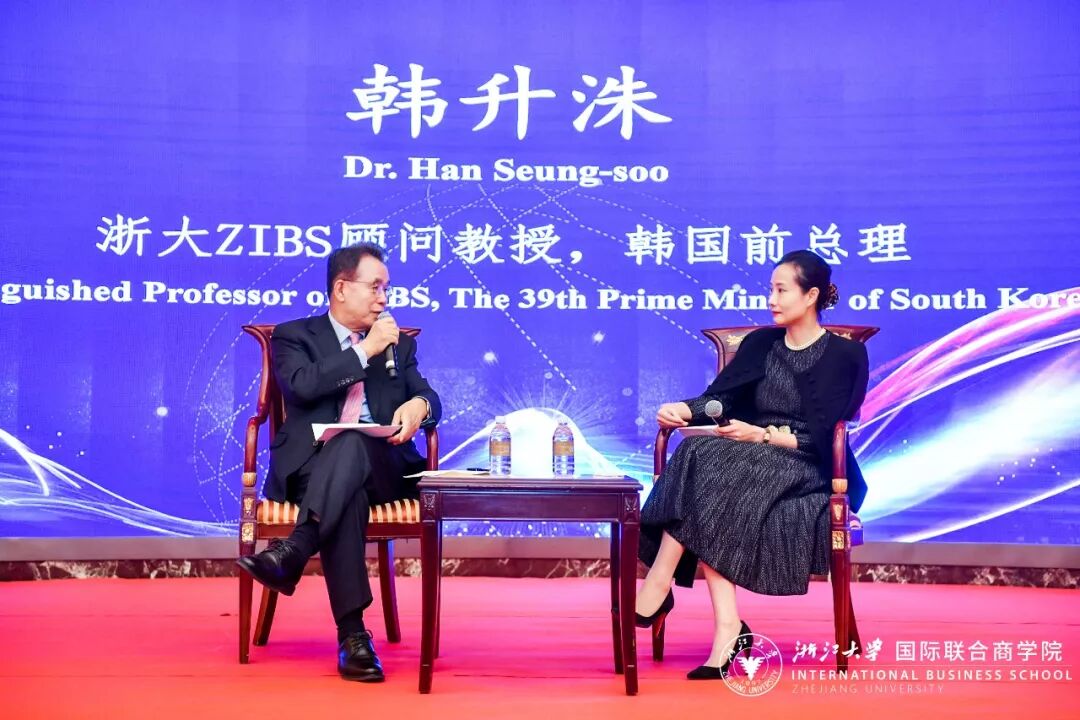 随后,世联行董事总经理胡紫岚女士代表浙大ZIBS总裁班学员与韩昇洙博士开展对话。韩昇洙回顾了其担任第56届联合国大会主席的经历,以及韩国应对亚洲金融危机和全球金融危机的经验,并发表了对于“逆全球化”、“中美贸易摩擦”、“中韩交流合作”、“绿色发展”等热点问题的观点。他还以亲身经历勉励大家拥有一个梦想,并为实现梦想时刻做好准备。